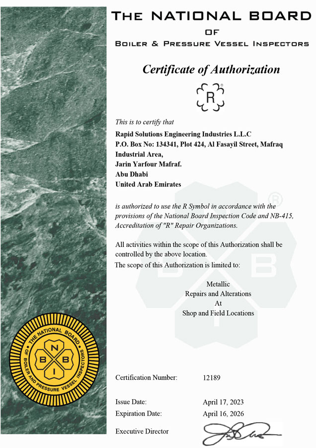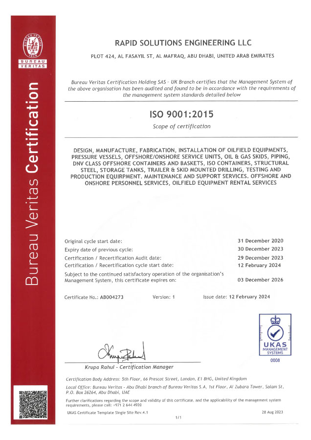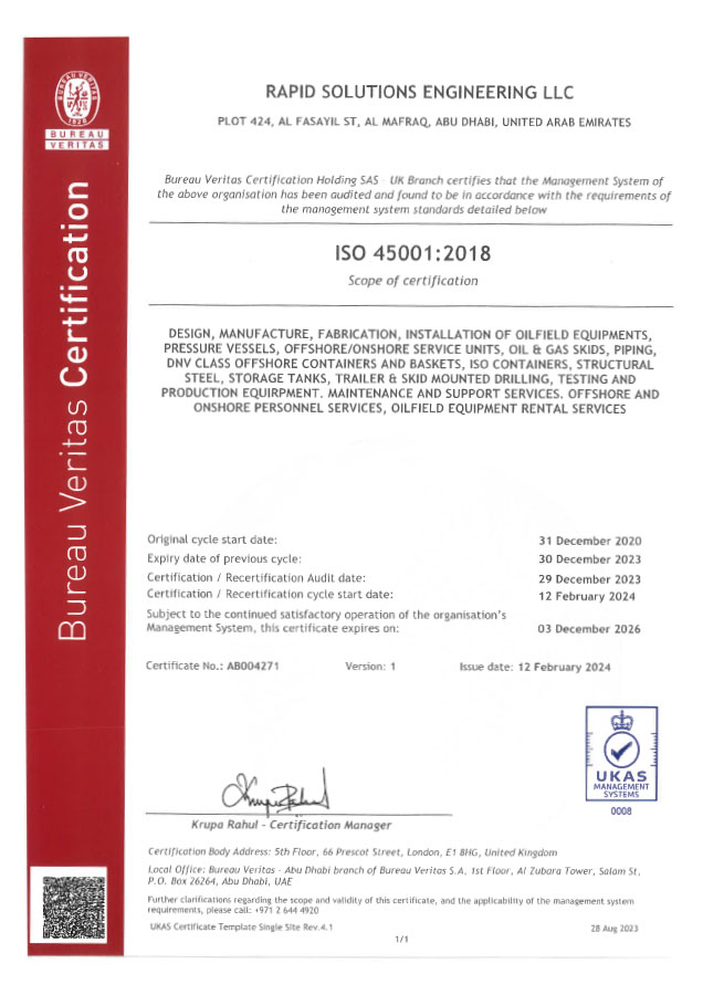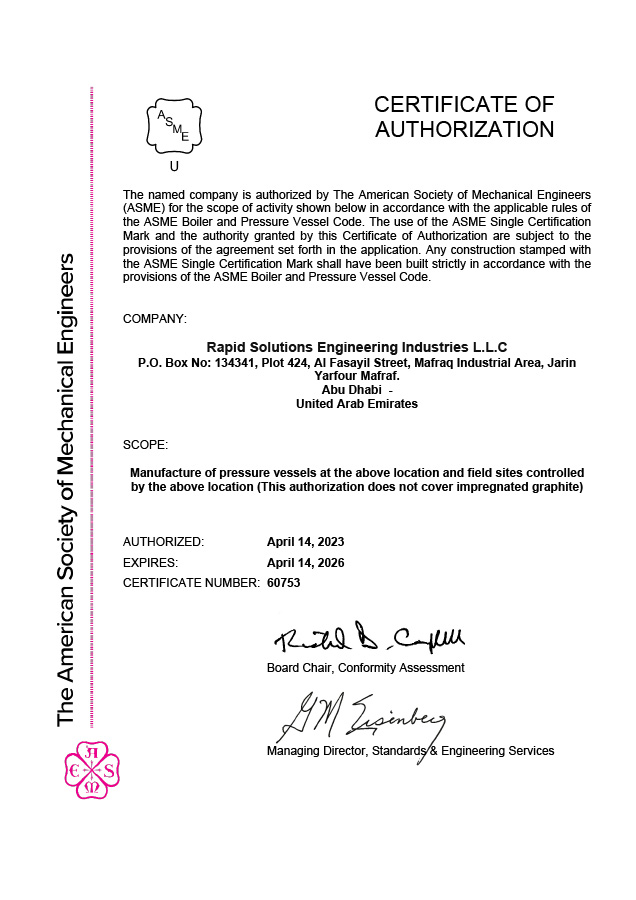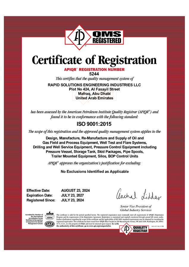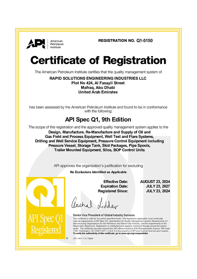 At Rapid Solutions, our commitment to excellence is reflected in our adherence to the highest international quality and ethical standards. Our manufacturing and service facilities hold prestigious certifications, including ISO 9001:2015, ISO 14001:2015, ISO 45001:2018, API Q1, ASME “U”, and NB “R” certifications—underscoring our dedication to quality, environmental responsibility, and workplace safety.